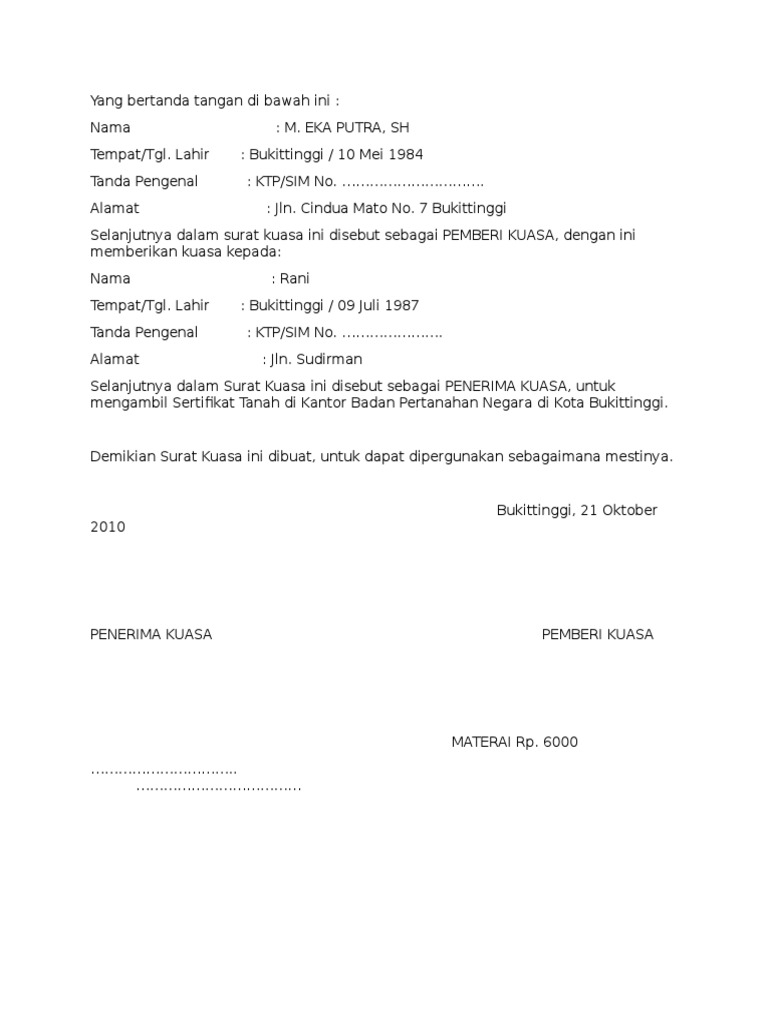 . Jalan Kayu Tinggi No. Demikian Surat Pemberian Kuasa Pengambilan Sertifikat Tanah ini saya buat dengan penuh kesadaran dan keadaan sebenarnya tanpa ada paksaan untuk selanjutnya dapat dipergunakan semestinya. Memaklumi paradigma kopi kuasa persil yaitu salah satu keadaan berharga terutama buat mereka yang berkutat pada bisnis jual beli persil ataupun transaksi yang melibatkan kepemilikan tanah dan bangunan.