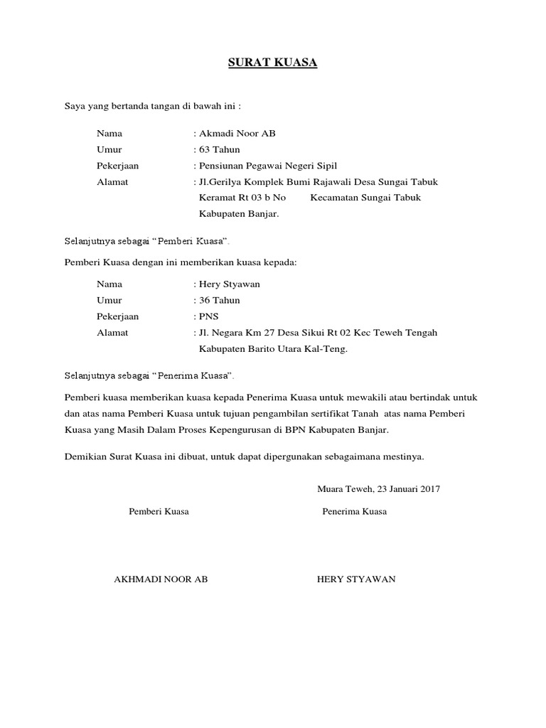 Demikian surat kuasa ini kami buat dengan sebenar-benarnya. Nah itulah ulasan lengkap mengenai contoh surat kuasa pengambilan sertifikat tanah terbaru tahun 2022. 3 Pihak penerima kuasa sudah berumur 17 tahun ke atas atau dewasa.